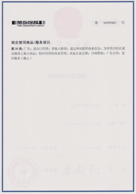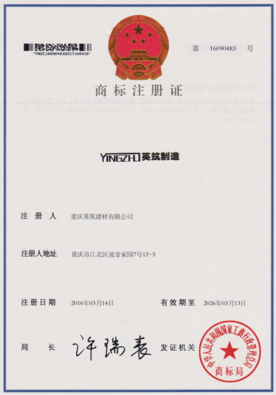 2015年1月6日我司向国家工商行政管理总局商标局提出申请注册“英筑制造”这个商标,申请号为:16090483。发文编号:TMZC16090483ZCSL01。至从申请”英筑制造“商标以来,经过短短3个月,我公司的商标注册申请受理通知书就已经下来了。直到2016年3月14日我司商标正式注册成功,并于2016年5月28日我司按期取得商标注册证书。在这里非常感谢北京东灵通知识产权服务有限公司重庆分公司的大力帮助与支持!