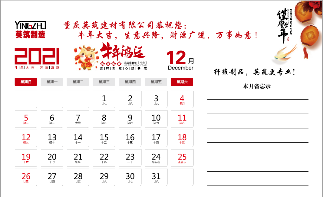 尊敬的各位领导和朋友们:重庆英筑纤维公司“2021新年台历”已经于2020年12月23日开始寄发和派送,敬请大家注意查收。