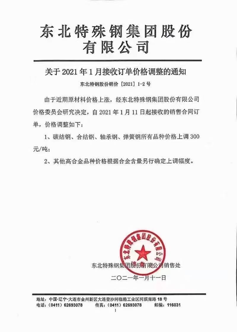 由于近期钢材原材料价格持续上涨,接东北特殊钢集团股份有限公司价格委员会通知,从2021年1月11日起签订的销售合同,价格调整如下: