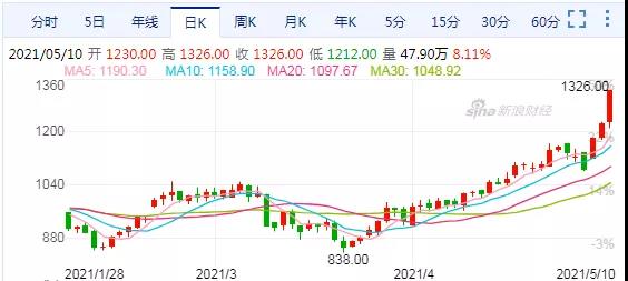 金三银四之后的五月,钢材市场的上涨趋势不仅没有丝毫收敛,反而是越发不可收拾,上演疯狂冲高走势。继节后三个交易日累涨500元后,昨日唐山钢坯再涨150元报5500元,今日黑色系钢矿等上演集体涨停潮,钢厂动辄300-400的涨,钢价单日上涨400-500,如此可怕的涨价势头不知道还要持续多久。1、黑色系暴涨,钢矿集体涨:停受唐山钢坯大涨提振,今日黑色系全线高开,热卷、螺纹钢、铁矿石、焦煤品种主力合约相继涨停。截至收市,螺纹钢主力报6012(340,5.99%),热卷主力报6335(358,5.99%),铁矿石主力报1326(120.5,10.00%);焦煤临近收市涨停,焦炭也录得4.35%的涨幅。